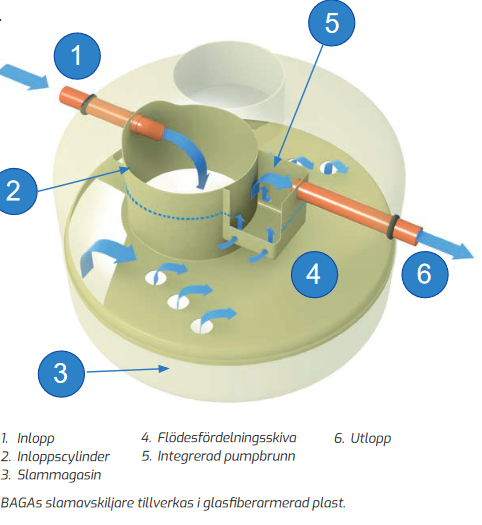 BAGAs patenterade slamavskiljare arbetar efter helt egna principer vilket ger den unika egenskaper där slamflykten ut från slamavskiljaren knappt är mätbar. Den stora fördelen är naturligtvis att så lite slam som möjligt kommer ut i efterföljande bäddar vilket i stort sett eliminerar risken för igensättning. Konstruktionen ger också en hel del andra fördelar såsom möjlighet till pumpning direkt från slamavskiljarens inbyggda pumpbrunn, inblandning av flockningsmedel direkt i slamavskiljare mm.