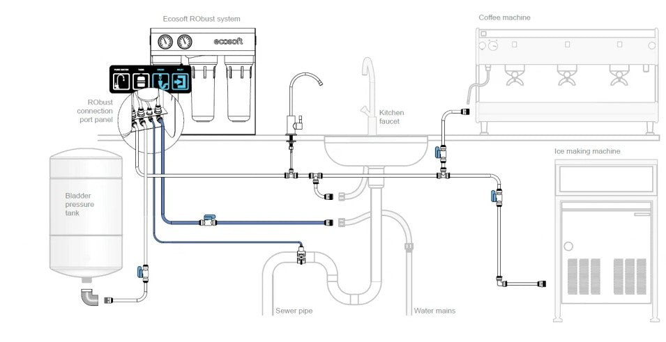 Med hjälp av denna sats kan du ansluta en extra tank för vattenförvaring, en espressobryggare eller till och med en ismaskin till RObust professionella vattenreningssystem.