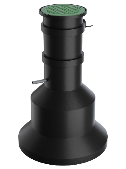 Pumpbrunnen har en klotformad underdel som ger plats för en stor pumpsump (150l) och votad botten. Den är i sin tur monterad på en slät platta med stöd. Plattan har två funktioner, dels minimerar den risken för att den flyter upp vid högt grundvatten och dels gör den monteringen väldigt enkel då den står plant och still vid återfyllningen av gropen, man klarar det lätt om man är ensam i grävmaskinen.