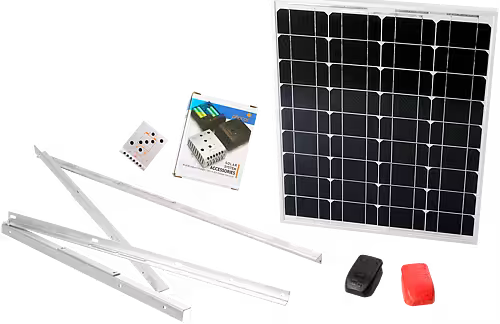 Innehåller soleceller 50W, konsol för montering på vägg eller tak, regulator samt polskor till batteri.