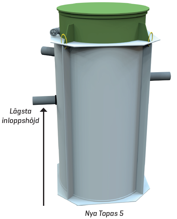 då man installerar allt som en enhet. Trots detta har Topas lyckats bibehålla det justerbara inloppet som underlättar installation i bergig miljö. Självklart säljs Topas 5 även som enbart reningsverk och kompletteras då med separat grovrenstank eller en befintlig duglig slamavskiljare.