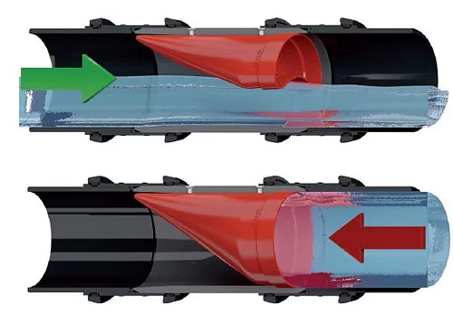 Flödet i strömningsriktningen bildar tryck mot membranet vilket gör att membranet öppnar sig precis så mycket som behövs för att tillåta flödet att passera obehindrat. Vid tillbakaflöde fylls membranet med vatten eller gas och fungerar som en propp i röret. WaStop® blockerar allt tillbakaflöde i röret eller avloppet. WaStop® backventil kan utformas för att klara upp till 12 meters baktryck.